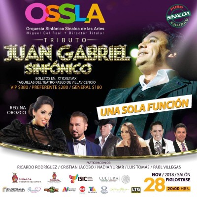 La Orquesta Sinfónica Sinaloa de las Artes suspendió el Tributo Juan Gabriel Sinfónico que presentaría hoy, en el Salón Figlostase, a las 20:00 horas.