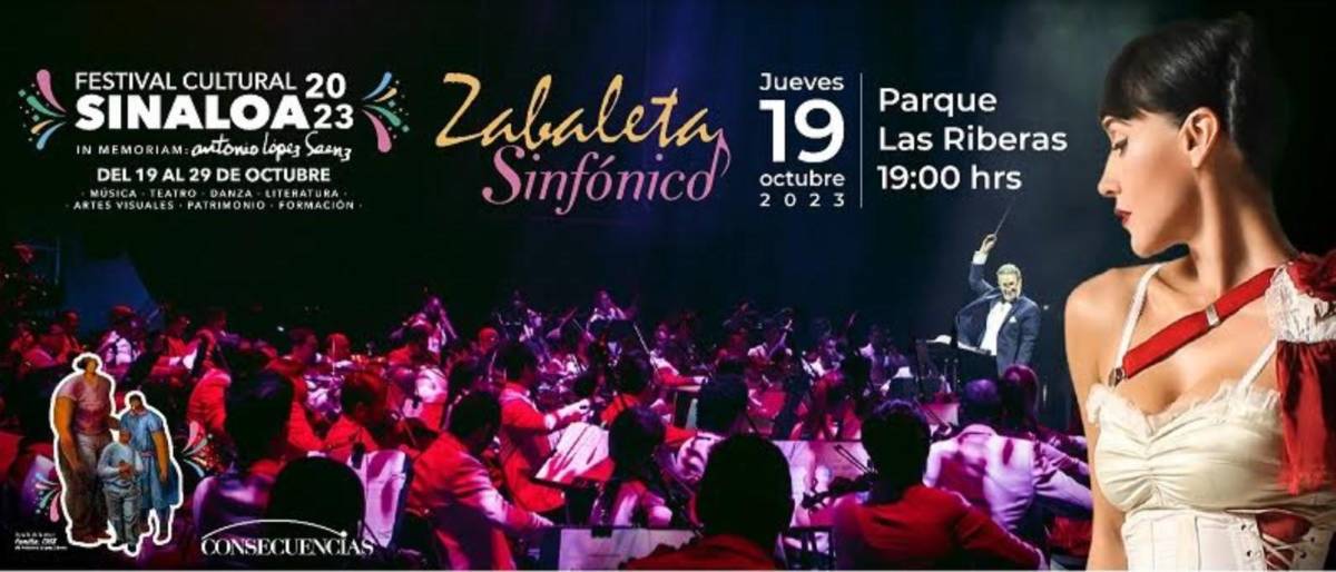 Este jueves 19 de octubre es el gran inicio del Festival Cultural Sinaloa, 2023, con el concierto popular “Zabaleta Sinfónico”, a las 19:00 horas en el Parque Las Riberas, a cargo de la Orquesta Sinfónica Sinaloa de las Artes, bajo la dirección del Maestro Jacob Tapia, y como solista la cantante coahuilense Susana Zabaleta.