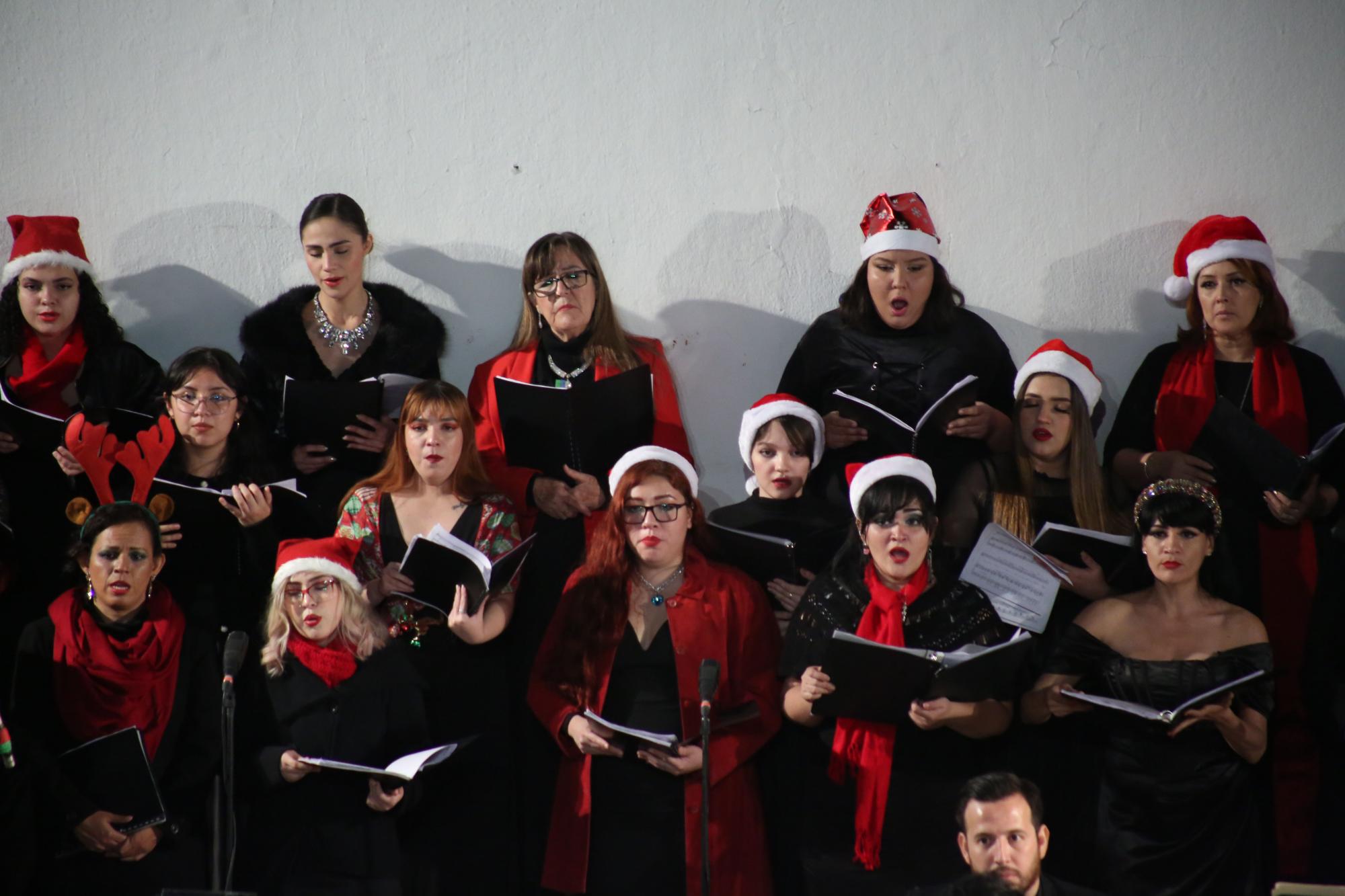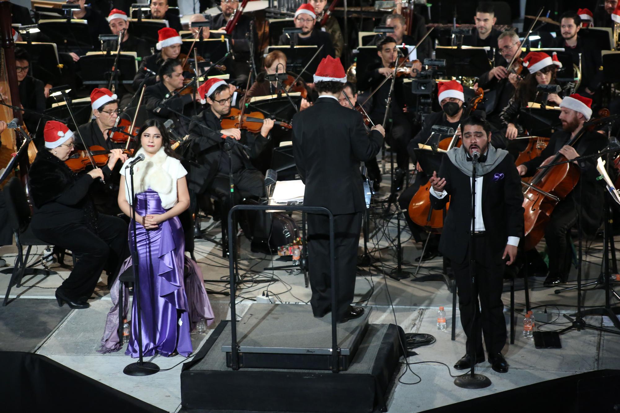 Temas clásicos de esta época decembrina, con algunos guiños de ballet, como el Cascanueces los compartieron más de 100 artistas sobre el escenario, entre músicos y cantantes, que portaban su corro de Santa Claus o cuernos de reno.