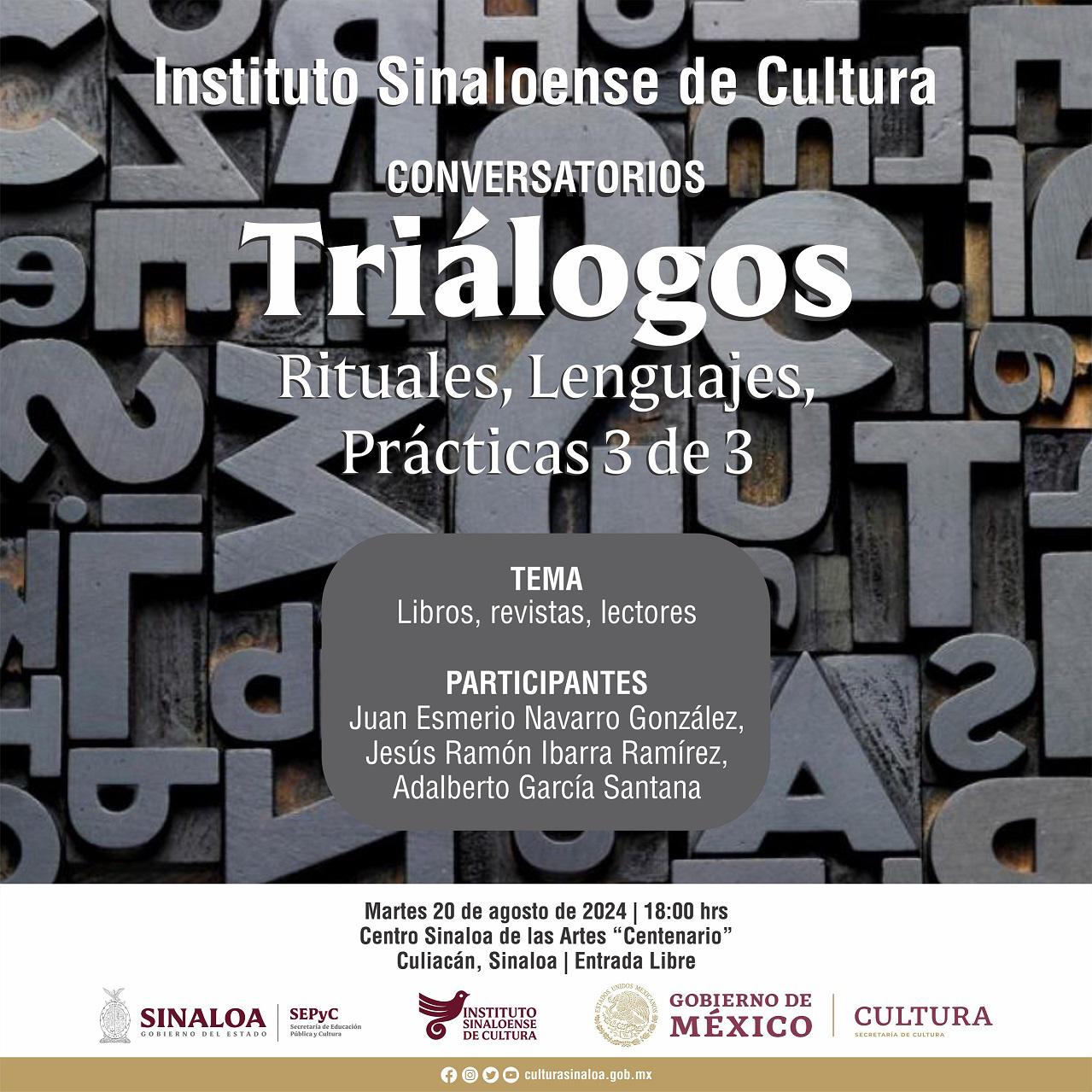 Este martes 20, a las 18:00 horas, se llevará a cabo el ciclo de conversatorios Triálogos: Rituales, lenguajes, prácticas 3 de 3, esta vez con el tema Libros, revistas, lectores, en el Centro Sinaloa de las Artes Centenario del Instituto Sinaloense de Cultura.