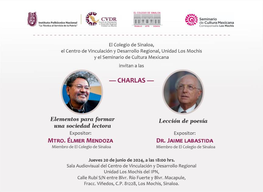 Elementos para formar una sociedad lectora y una lección de poesía compartirán el escritor Élmer Mendoza y el poeta y filósofo Jaime Labastida, ambos miembros de El Colegio de Sinaloa, con los mochitecos, este jueves 20 de junio, a las 18:00 horas, en el Centro de Vinculación y Desarrollo Regional del IPN.