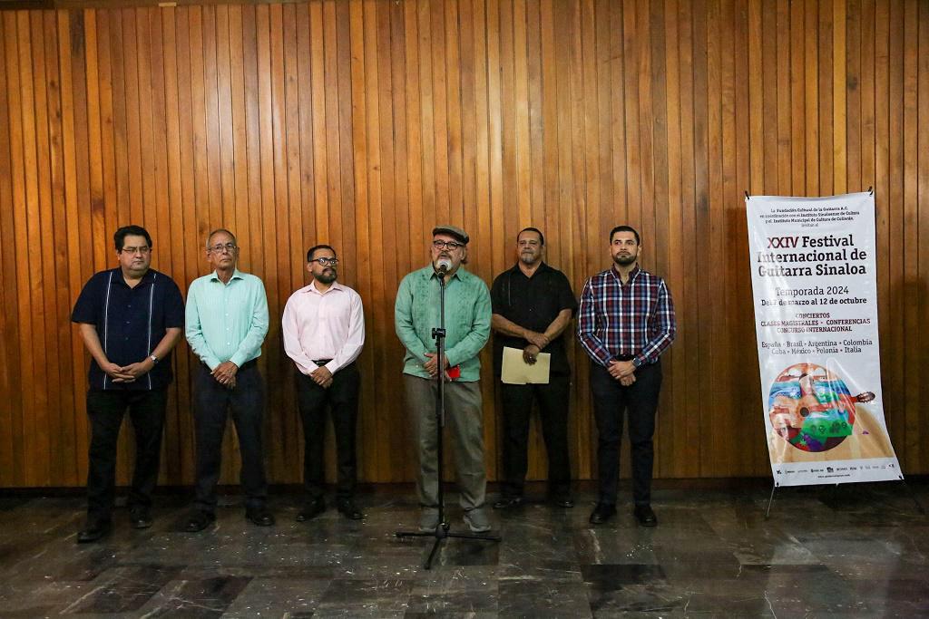 Rodolfo Arriaga Robles e integrantes de la Fundación Cultural de la Guitarra, durante la inauguración del Festival Internacional de Guitarra Sinaloa 2024.