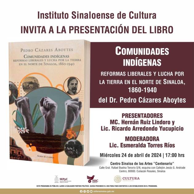 Este miércoles 24 a las 17:00 horas, en el Centro Sinaloa de las Artes Centenario, se presenta el libro Comunidades indígenas, reformas liberales y lucha por la tierra en el norte de Sinaloa, 1860-1940, del Dr. Pedro Cázares Aboytes, una edición del Instituto Sinaloense de Cultura.