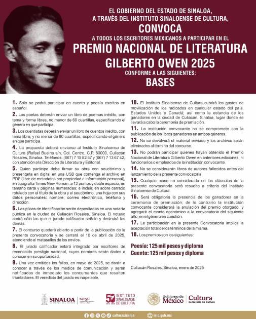 Con premios en efectivo por 125 mil pesos en cada género, el Gobierno del Estado, a través del Instituto Sinaloense de Cultura, lanzó la convocatoria a todos los escritores mexicanos a participar en el certamen del Premio Nacional de Literatura Gilberto Owen 2025, en poesía y cuento.