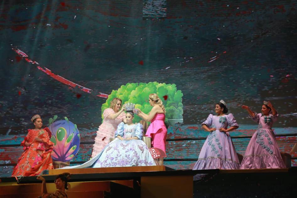 Portando un majestuoso vestido en color azul cielo, el cual tiene palomas bordadas en color rosa y flores, la nueva majestad de los niños recibió sus atributos reales sobre el escenario.