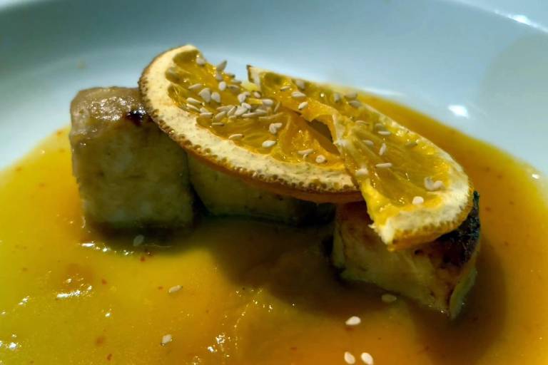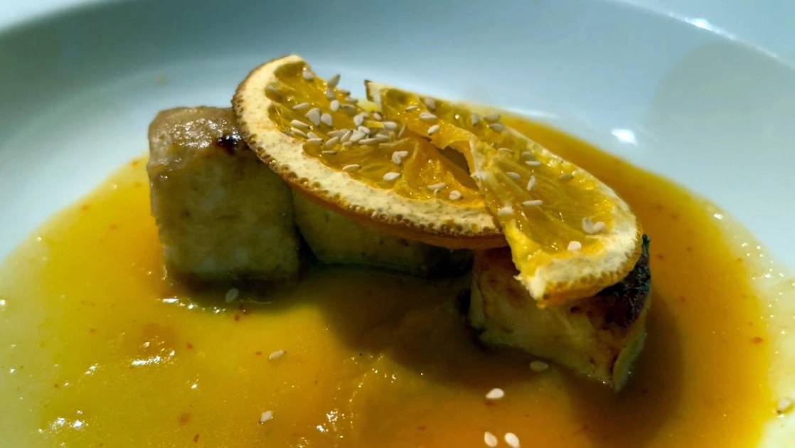 Permítame saltarme seis tiempos para referirme al exquisito pollo a la naranja que degusté, que por justicia debieron llamarlo de otro modo, no sé, algo más chics, porque los cubos de pechuga de pollo que llegaron a mi mesa estaban perfectos, carne que primero fue congelada para poder cortar líneas rectas exactísimas, logrando los cubos, que luego llevaron al alto vacío con un marinado de ajo y jengibre, luego a cocción lenta (Sous vide), después sellados al horno con salsa cantonesa, presentados con dos salsas de autor: una de Kathy Gamboa y otra de la chef Angelly Jacobo.