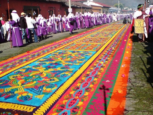 Los habitantes de esta ciudad Patrimonio de la Humanidad elaboran el trabajo artesanal al inicio de la Cuaresma. Invierten horas en pintar aserrín y harina, y en diseñar figuras geométricas que se plasman en las alfombras. En esa labor participan familias enteras y visitantes, quienes se ofrecen como voluntarios durante el montaje, un día antes del Viernes Santo.