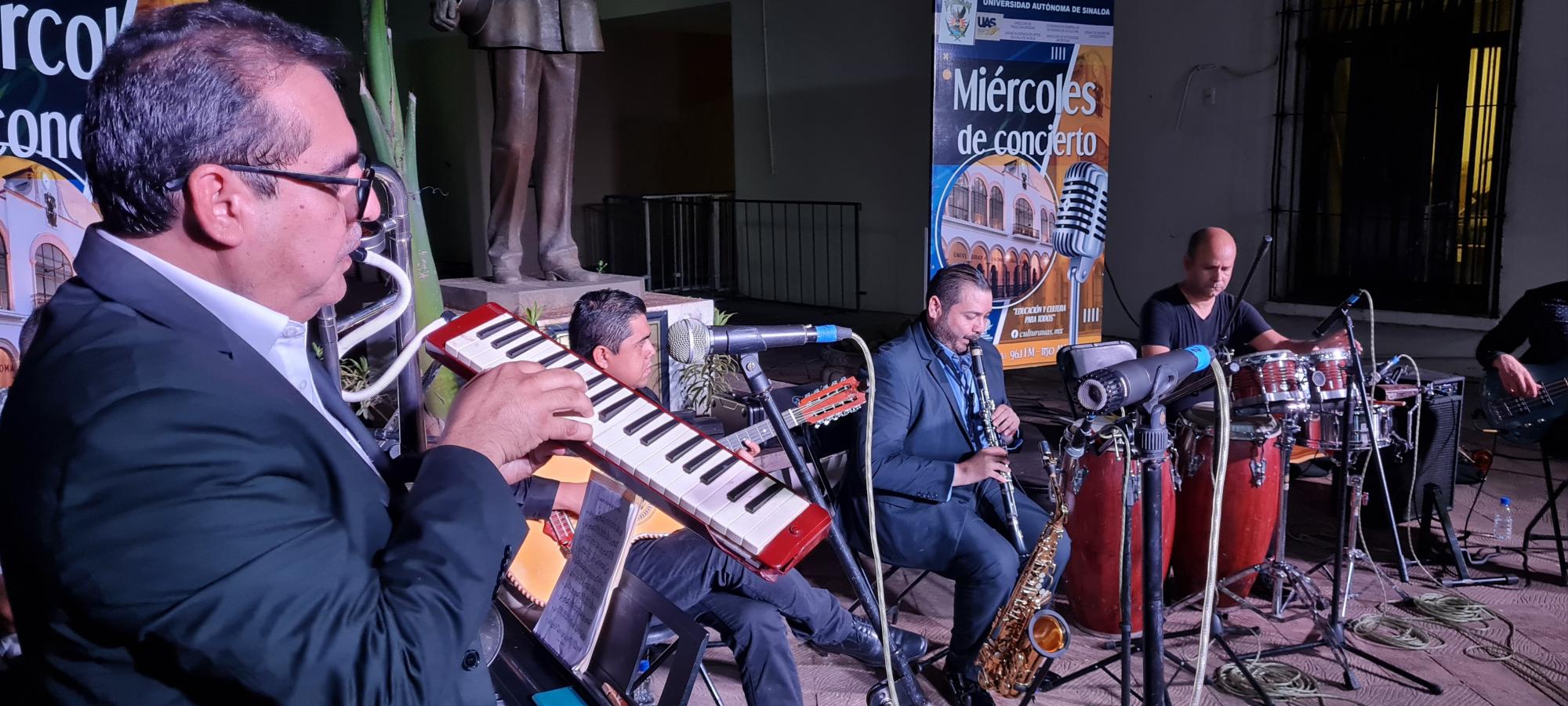 Con temas como Brisas de Mocorito, de la compositora sinaloense Chayito Valdez, Clarinete polka, Culiacán, de Enrique Sánchez Alonso El Negrumo y Mazatlán, de Gabriel Ruiz, la banda integrada por Adrián Meza Laveaga, Ramón Meza, Daniel López Manjarrez, Marco Vinicio Díaz González y Raymundo López González contagió de alegría el recinto universitario.