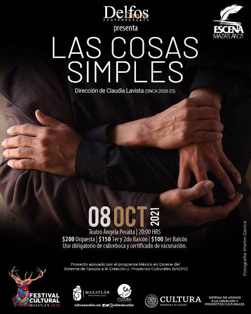 Con la función “Las cosas simples” a cargo La Compañía Delfos Danza Contemporánea, se cerrará este viernes 8 de octubre el programa del Festival de Teatro Escena Mazatlán 2021, que promueve el Instituto de Cultura, Turismo y Arte de Mazatlán.