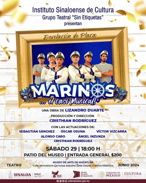 Tras 25 presentaciones realizadas en Mazatlán, en diversos espacios culturales, la obra “Marinos: el casi musical”, tendrá develación de placa en el patio del Museo de Arte de Mazatlán, el sábado 29 de junio, a las 18:00 horas.