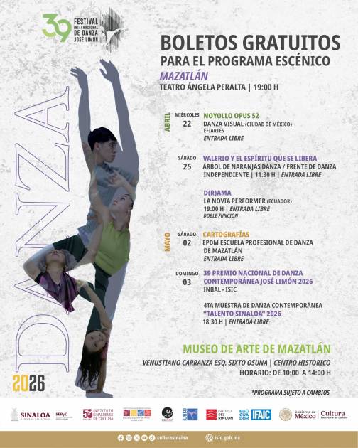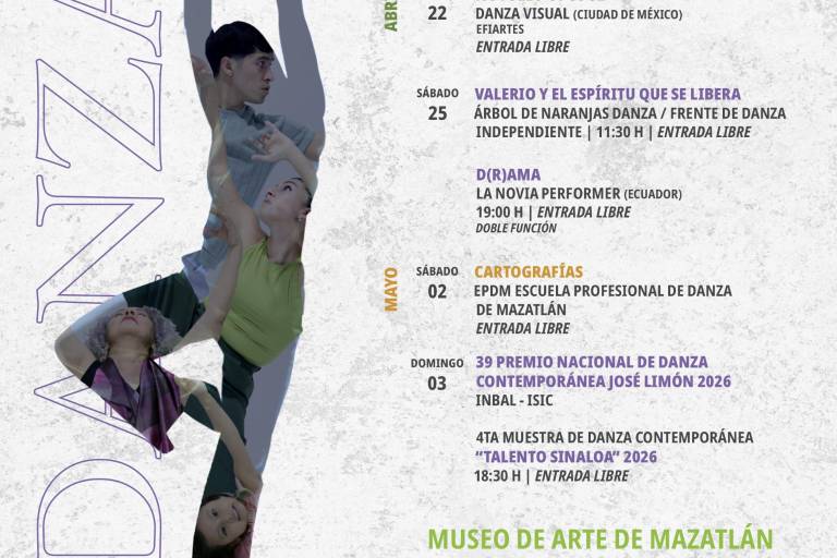 El programa contempla la participación de compañías como Danza Visual, Árbol de Naranjas y La Novia Performer, además de presentaciones de la Escuela Profesional de Danza de Mazatlán y la Cuarta Muestra de Danza Contemporánea “Talento Sinaloa 2026”.