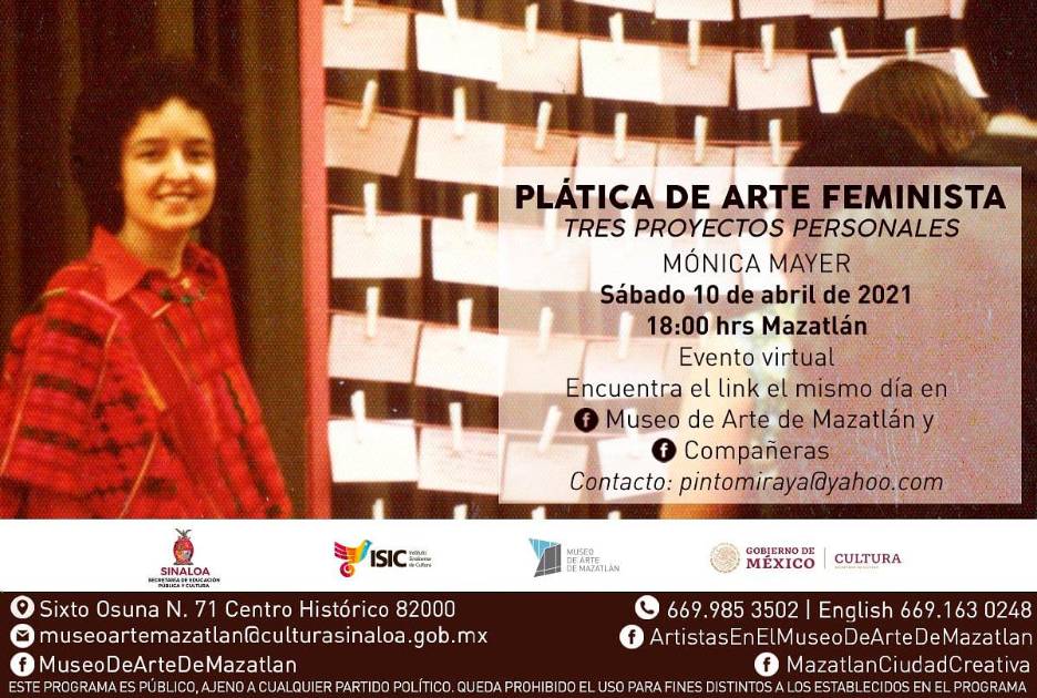 A las 18:00 horas se efectuará la segunda videoconferencia virtual, titulada Plática de arte feminista. Tres proyectos personales, que será impartida por la artista Mónica Mayer.