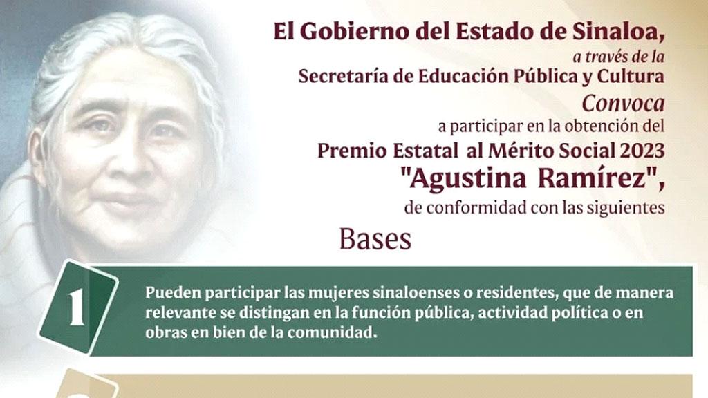 La fecha límite para presentarlas será el día viernes 20 de enero de 2023, y el Premio consistirá en una medalla de oro de tres y medio centímetros de diámetro y tres milímetros de espesor, en cuyo anverso resaltará la efigie de “Agustina Ramírez” y, en su reverso, el escudo del Estado de Sinaloa; así como la cantidad de 30 mil pesos.
