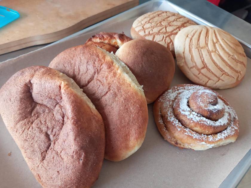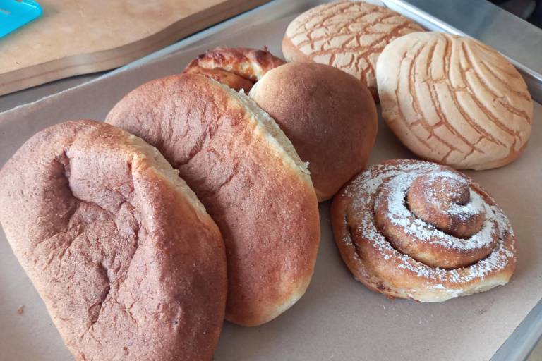 “Aquí tenemos pan de mujer natural, con piloncillo, con calabaza, pero también hay conchas, pan integral, pan relleno de queso-crema, con cajeta, nutela, tortas, roles y bisquets”, destacó la encargada.