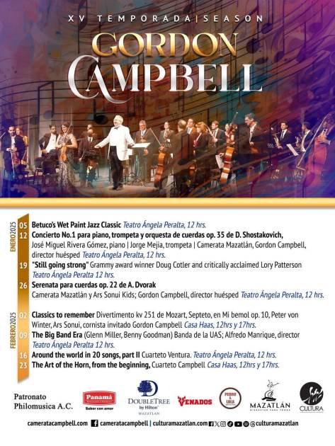 El 12 de enero: Concierto para piano, trompeta y orquesta de Shostakovich con la Camerata Mazatlán. El 19 de enero: “Aún soy fuerte” con Doug Colter y Lory Patterson.