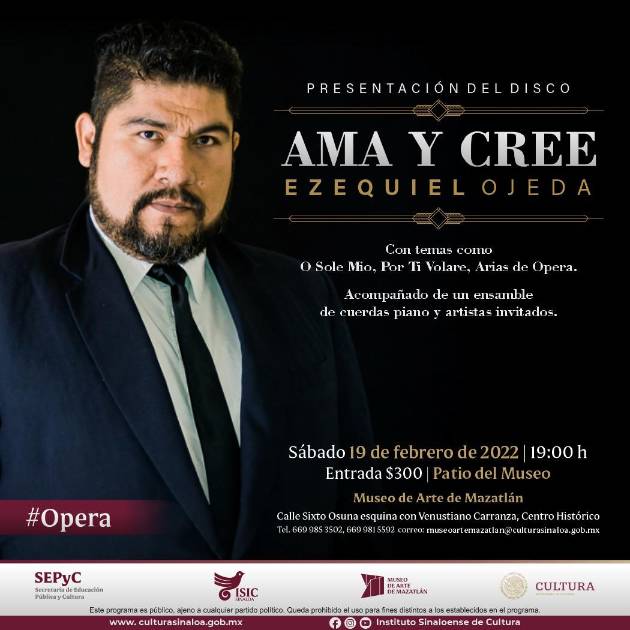 El Instituto Sinaloense de Cultura, a través de su Delegación Sur, en el Museo de Arte de Mazatlán, invita al gran concierto este sábado 18 de febrero, con el reconocido tenor Ezequiel Ojeda, quien presentará su disco Ama y cree, con un concierto acompañado de piano y ensamble de cuerdas, en punto de las 18:00 horas, en el patio del museo.
