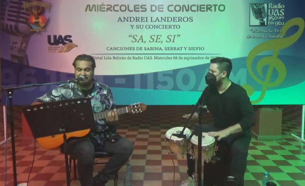 En evento transmitido vía Facebook Live a través de las cuentas Cultura UAS y Radio UAS, la velada arrancó con el tema Princesa, del cantautor y poeta español Joaquín Sabina, seguido de Penélope, de Joan Manuel Serrat, así como Ángel para un final del guitarrista y poeta cubano Silvio Rodríguez.