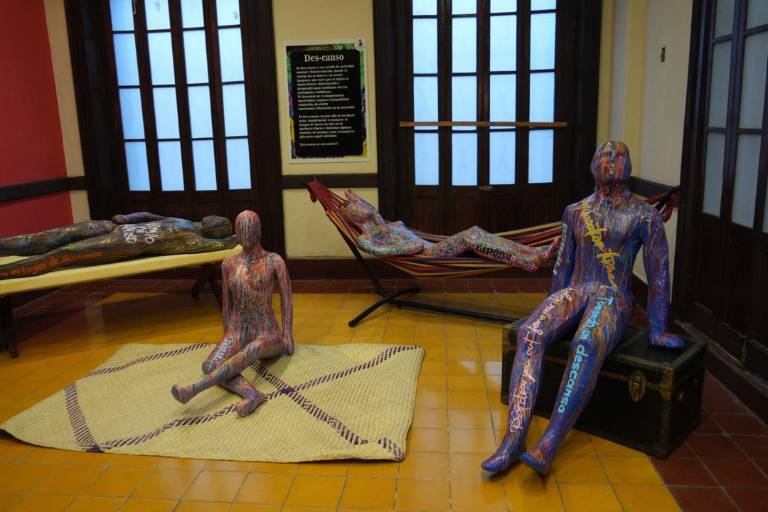 La autora compartió que la instalación está inspirada en el descanso “el descanso es algo que actualmente la sociedad no practica y que es muy necesario”. Mientras que las esculturas están inspiradas en el caballo, su animal favorito y las manos, que son muy importantes para ella pues las utiliza cada día. En su proceso creativo utilizó corcho y resinas epóxicas para darles brillo.