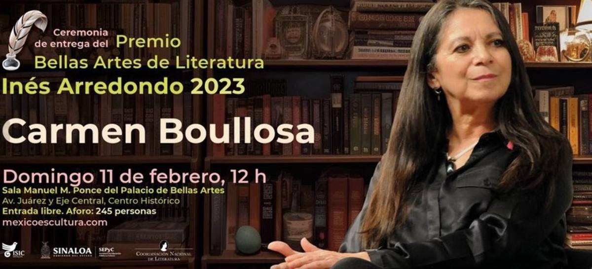 MÉXICO._ Este domingo 11 de febrero se entregará el Premio Bellas Artes de Literatura Inés Arredondo 2023 a la escritora Carmen Boullosa, en un evento a realizarse a las 12:00 horas, en la Sala Manuel M. Ponce del Palacio de Bellas Artes, con una lectura dramatizada a cargo de Brian Omar y Miranda Ruiz Owen.