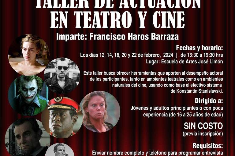 A partir de este lunes 12 y hasta el 22 de febrero, el Instituto Sinaloense de Cultura llevará a cabo el Taller de Actuación en Teatro y Cine que impartirá el maestro Francisco Haros Barraza, el cual está dirigido a jóvenes y adultos principiantes o con poca experiencia en el mundo de la actuación, el cual se impartirá en forma gratuita (previa inscripción).