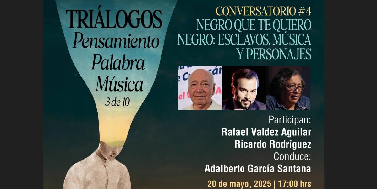 Este martes 20 de mayo a las 17:00 horas, continúa el ciclo de conversatorios Triálogos: pensamiento, palabra, música, esta vez con el tema Negro que te quiero negro: Esclavos, música y personajes, a cargo del Dr. Rafael Valdez Aguilar y del tenor Ricardo Rodríguez y, en la conducción, Adalberto García Santana, en el Centro Sinaloa de las Artes Centenario del Instituto Sinaloense de Cultura, con entrada libre.