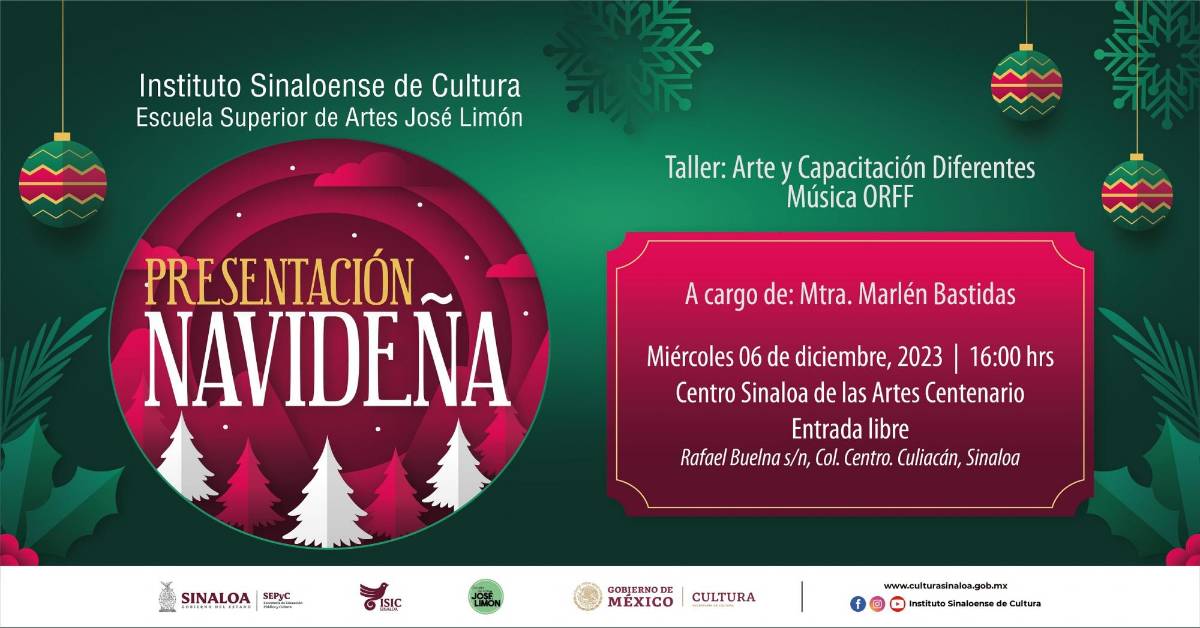 Este miércoles 6 de diciembre a las 16:00 horas, inicia el ciclo de Presentaciones Navideñas 2023 de alumnos de los diversos talleres de la Escuelas de Artes José Limón del Instituto Sinaloense de Cultura, con la presentación de los alumnos del Taller Arte y Capacidades Diferentes y de Música Orff, a cargo de la maestra Marlén Bastidas, en el patio del Centro Sinaloa de las Artes Centenario.