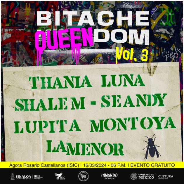 Una nueva edición del ciclo Bitache QueenDom Vol. 3 se llevará a cabo en el ágora Rosario Castellanos del Instituto Sinaloense de Cultura, a partir de las 18:00 horas, esta vez con un programa hecho por mujeres que cantan, componen y se expresan libremente.