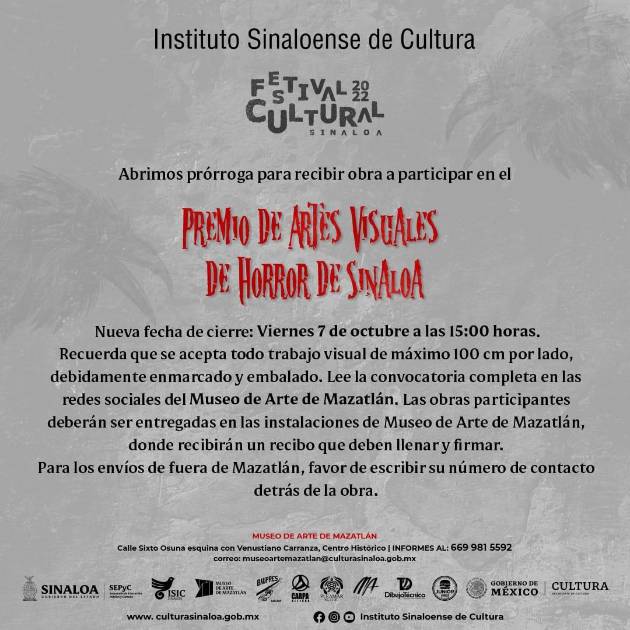 Cabe destacar que el premio se efectuará como parte del Festival del Horror en las Artes que promueve el Instituto Sinaloense de Cultura en Mazatlán, del 26 al 29 de octubre en el Museo de Arte de Mazatlán.
