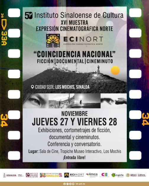 Este viernes 28 concluye la décimo sexta Muestra Expresión Cinematográfica Norte 2025, organizada por el Instituto Sinaloense de Cultura, con la premiación a los mejores cortometrajes seleccionados en sus diversas categorías y disciplinas, en un evento con sede en la Sala de Cine de Trapiche Museo Interactivo en Los Mochis.