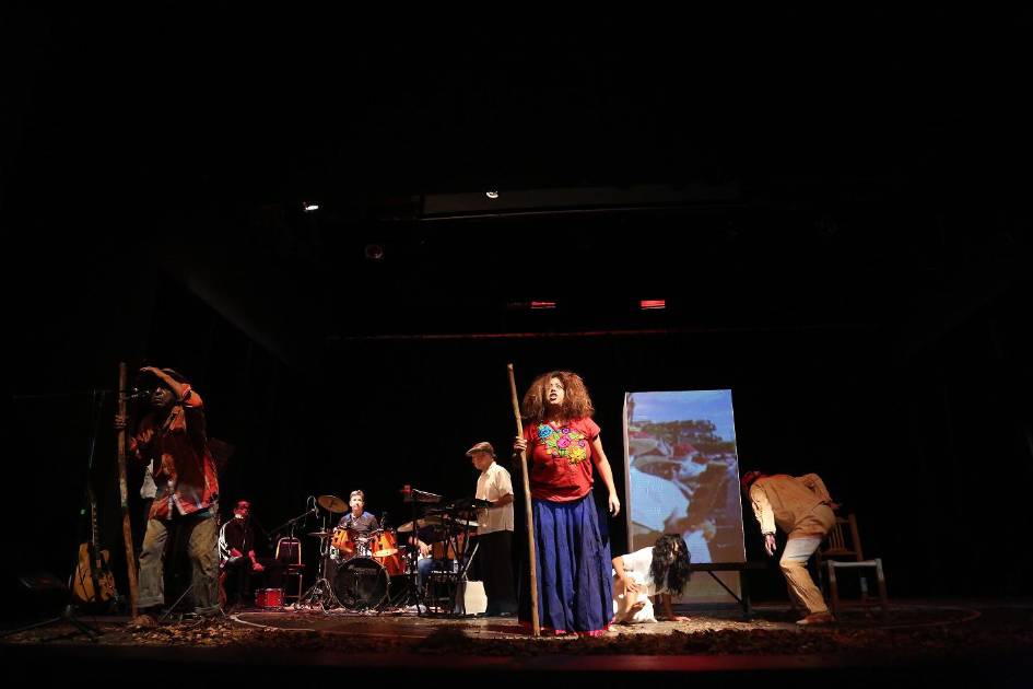 En un espacio escénico delineado por un círculo con grava de río, una banca y una mampara sobre la que se visualizan imágenes, los músicos interpretan diversas melodías populares, mientras los actores y bailarines hacen lo suyo, involucrando a todo el Colectivo.