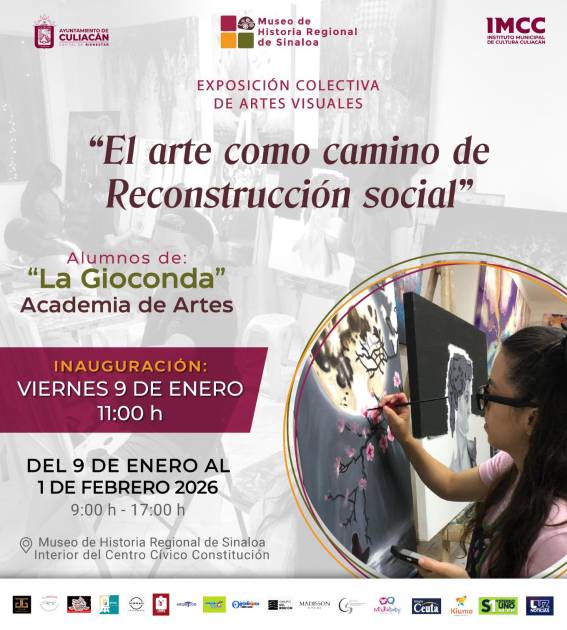 El Instituto Municipal de Cultura Culiacán invita a la inauguración de la exposición de artes visuales “El arte como camino de reconstrucción social” de alumnos de La Gioconda Academia de Artes, este viernes 9 de enero a las 11:00 horas, en la Galería del Museo de Historia Regional de Sinaloa.