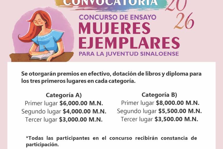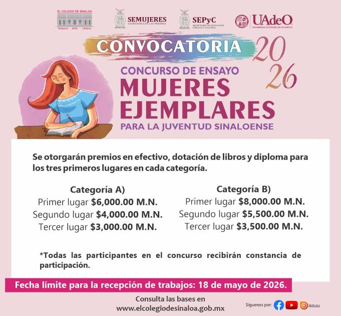 El Colegio de Sinaloa informó que la recepción de los trabajos para el Concurso de Ensayo Mujeres Ejemplares para la Juventud Sinaloense 2026, se extendió y cerrará el próximo lunes 18 de mayo.