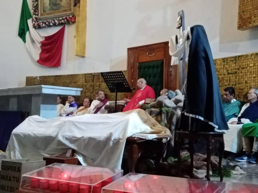 El contingente salió de los arcos del Fraccionamiento El Cid, para internarse por la Camarón Sábalo, hasta llegar al templo donde efectuaron los oficios del Viernes Santo ante la imagen de Jesús cubierta por una manta blanca, y la Virgen María vestida de luto, ahí, los asistentes meditaron sobre las siete palabras de Jesús y rezaron el credo. Al final, se realizó el rosario de pésame.