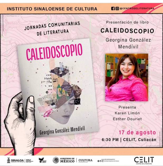 La Dirección de Literatura del Instituto Sinaloense de Cultura invita a la presentación, de la novela “Caleidoscopio”, de Georgina González Mendívil, en un acto que se llevará a cabo en el Centro de Literatura (CELIT) del Centro Cultural Genaro Estrada, este jueves 17 a las 18:30 horas, con los comentarios de las escritoras Karen Limón y Esther Douriet.