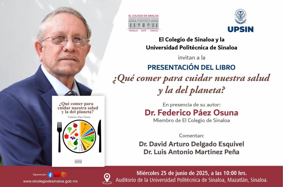 Como parte de sus actividades como miembro de El Colegio de Sinaloa, el Doctor Federico Páez Osuna presentará su libro más reciente: ¿Qué comer para cuidar nuestra salud y la del planeta? este miércoles 25 de junio, a las 10:00 horas, en el auditorio de la Universidad Politécnica de Sinaloa (UPSIN), del puerto de Mazatlán. La entrada es libre.