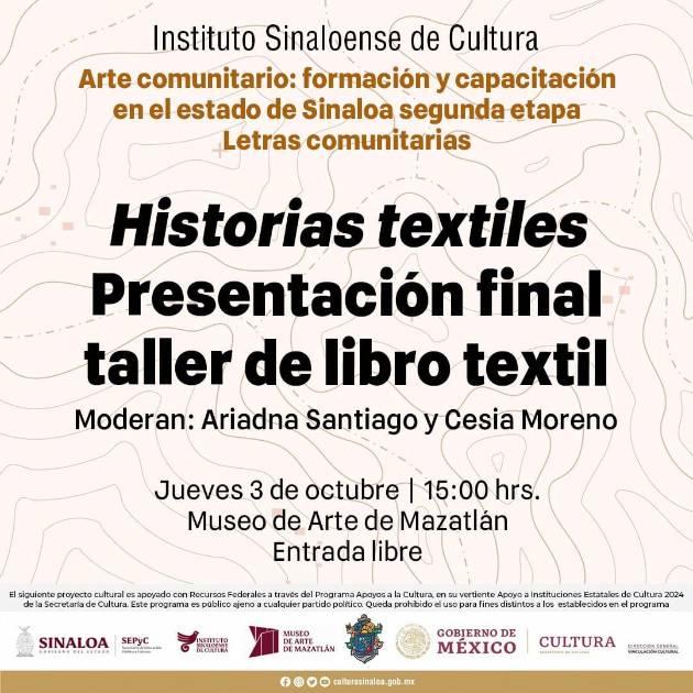 “Historias textiles”, muestra final del taller de libro textil, que se llevó a cabo como parte del programa de arte comunitario: capacitación y formación en el estado de Sinaloa, se presentará el 3 de octubre, a las 15:00 horas, en el Museo de Arte de Mazatlán.