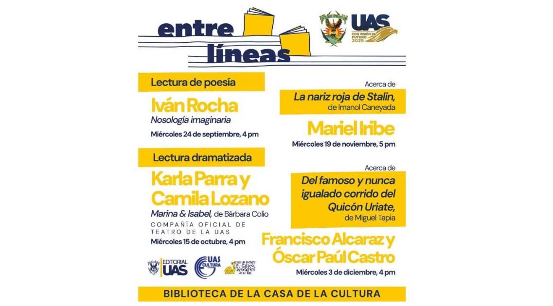 El primer evento es lectura de poesía a cargo de uno de nuestros autores que es el poeta Iván Rocha, ese será este miércoles 24 de septiembre a las 16:00 horas, el segundo será el 15 de octubre y será una lectura dramatizada del libro Marina e Isabel de Bárbara Colio y estarán dos actrices de la compañía oficial de teatro de la UAS, Karla Parra y Camila Lozano, ellas estarán a cargo de la dramatización de una parte de este libro.