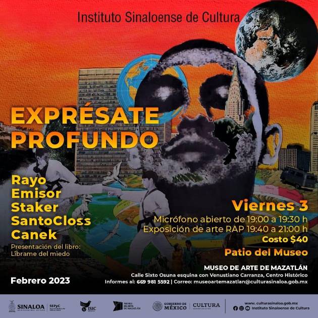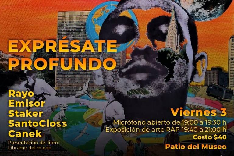 Una cita con la cultura se tiene preparada para este viernes 3 de febrero cuando se realice el evento titulado “Exprésate profundo”, en el que habrá diversas expresiones de rap, micrófono abierto y presentación del libro de poemas “Líbrame del miedo”, por parte de Ismael Canek.
