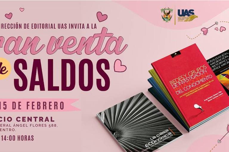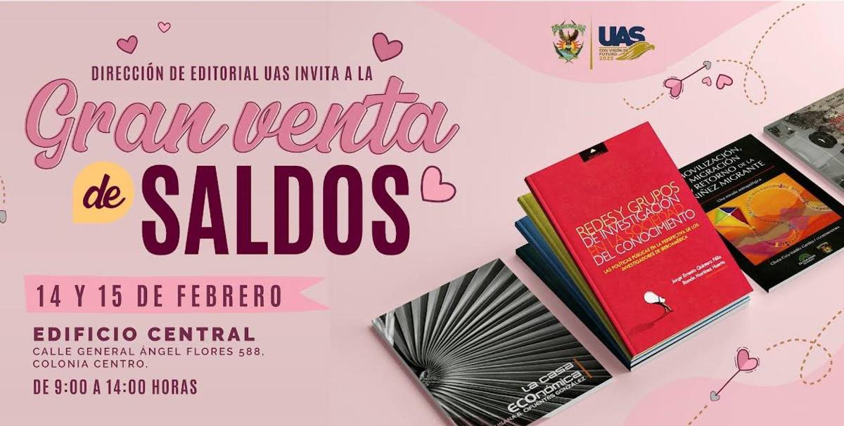 Con motivo del Día del Amor y la amistad, la Dirección de Editorial de la Universidad Autónoma de Sinaloa, invita a la venta de saldos que se realizará en el Edificio Central el 14 y 15 de febrero.