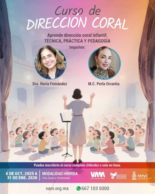El Instituto Sinaloense de Cultura, en coordinación con la SEPyC y de Vida y Arte para México A.C., invitan a participar en el Curso de Dirección Coral que impartirán Nuria Fernández y Perla Orrantia, en modalidad híbrida (vía Zoom y presencial) o solo en línea, en el que aprenderán técnica, práctica y pedagogía coral, y que se realizará del 6 de octubre de 2025 al 31 de enero de 2026.