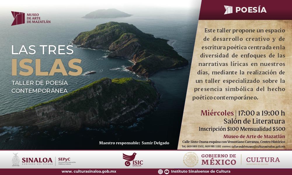 Como parte de los talleres artísticos que se abrirán próximamente en el Museo de Arte de Mazatlán, Delegación Sur del Instituto Sinaloense de Cultura, se abre el taller “Las Tres Islas”, en el que se realizarán actividades relacionadas con la escritura de poesía y sus diversos elementos que component un verso poético, impartido por Samir Delgado.
