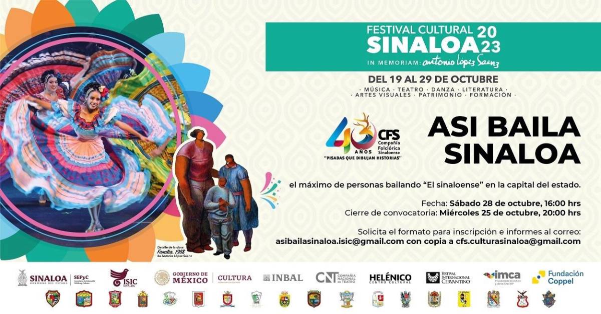 Una coreografía monumental llamada “Así baila Sinaloa”, se presentará el sábado 28 de octubre, a las 19:00 horas, y para participar podrán registrarse todas las compañías y grupos de danza folclórica de Sinaloa y bailarines independientes que quieran sumarse.