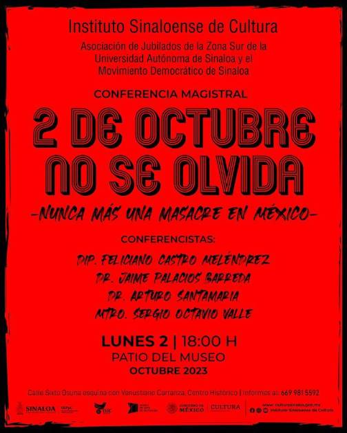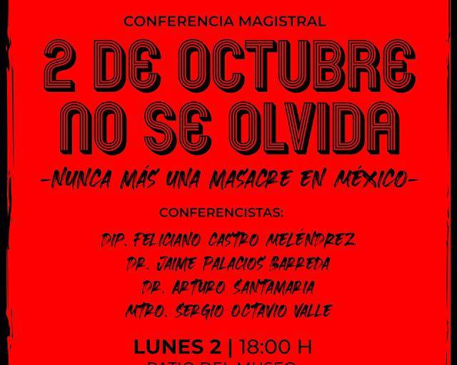 Recordar lo que sucedió el 2 de octubre de 1968, a fin de informar y no vuelva a suceder nunca más, es el propósito de la conferencia “2 de octubre no se olvida, nunca más una masacre en México”, que se llevará a cabo este lunes, a las 18:00 horas, en el Museo de Arte de Mazatlán.