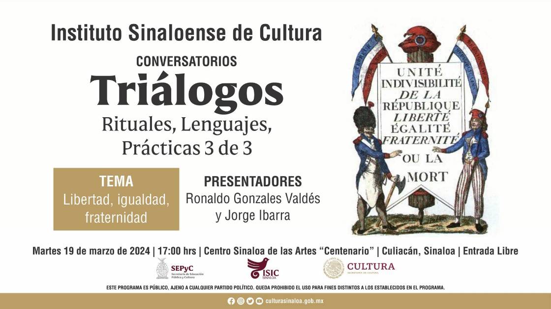 La Dirección de Patrimonio del Instituto Sinaloense de Cultura invita al ciclo de conferencias “Triálogos, Rituales, Lenguajes, Prácticas 3 de 3”, que estará conformado de nueve conversatorios mensuales, a partir del 19 de marzo.