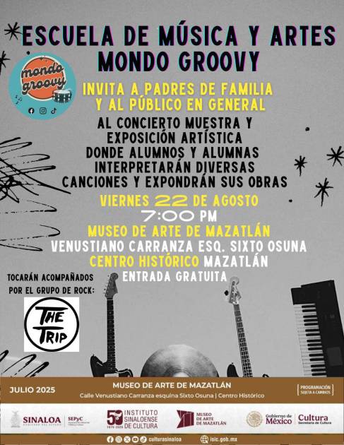 Escuela de Música y Artes Mondo Groovy, bajo la dirección de Julio Zataráin, presentará el espectáculo musical en el que se mostrará el progreso y talento de cada uno de sus alumnos, quienes tocarán diversos instrumentos musicales acompañados del grupo de rock The Trip.
