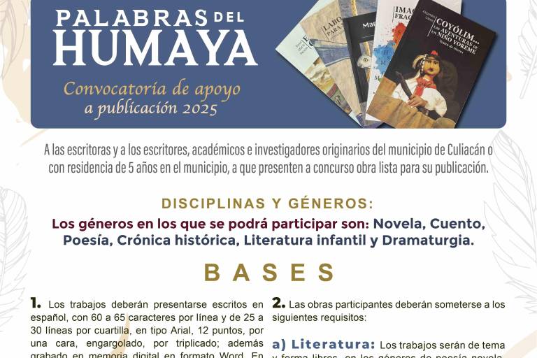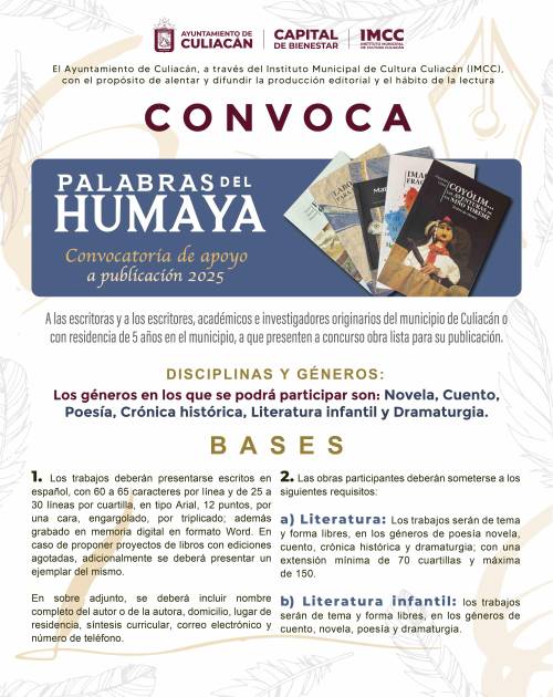 El Ayuntamiento de Culiacán, a través del Instituto Municipal de Cultura Culiacán, invita a escritores, académicos e investigadores culiacanenses o residentes en el municipio de Culiacán, participar en la convocatoria de apoyo a publicación 2025 “Palabras del Humaya” en los géneros de novela, cuento, poesía, crónica histórica, literatura infantil y dramaturgia.