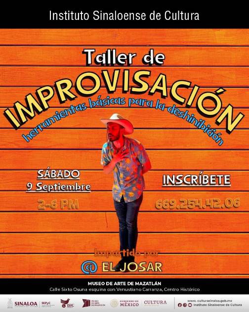 El Instituto Sinaloense de Cultura en su Delegación Sur, con sede en el Museo de Arte de Mazatlán, invita a estudiantes de teatro y público en general, al taller de improvisación teatral, a cargo de El Josar, el sábado 9 de septiembre de 14:00 a 18:00 horas.