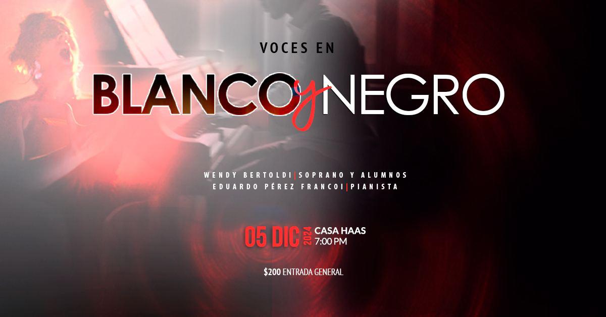 Voces en Blanco y Negro, un concierto exclusivo de piano y voz, donde la talentosa Wendy Bertoldi se unirá al virtuoso pianista Eduardo Pérez para ofrecer una experiencia única, que se llevará a cabo el jueves 05 de diciembre, en punto de las 19:00 horas en Casa Haas.