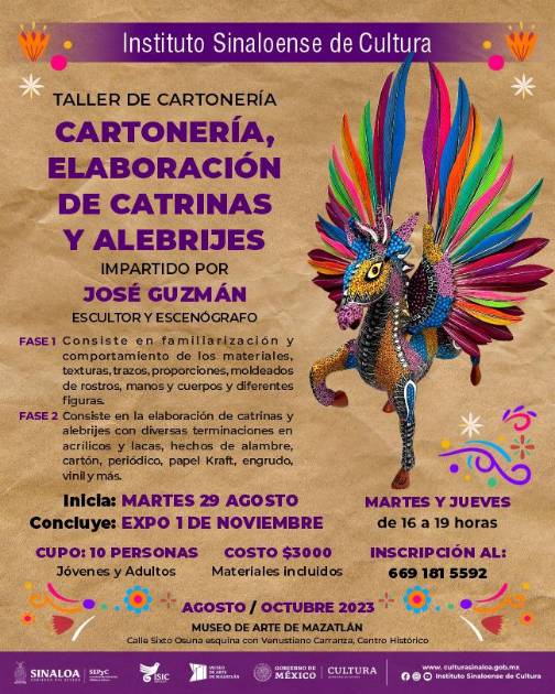 El Instituto Sinaloense de Cultura, a través del Museo de Arte de Mazatlán, invita a niños, jóvenes y adultos, al taller de cartonería impartido por José Guzmán, quien tiene gran trayectoria como escultor y escenógrafo.