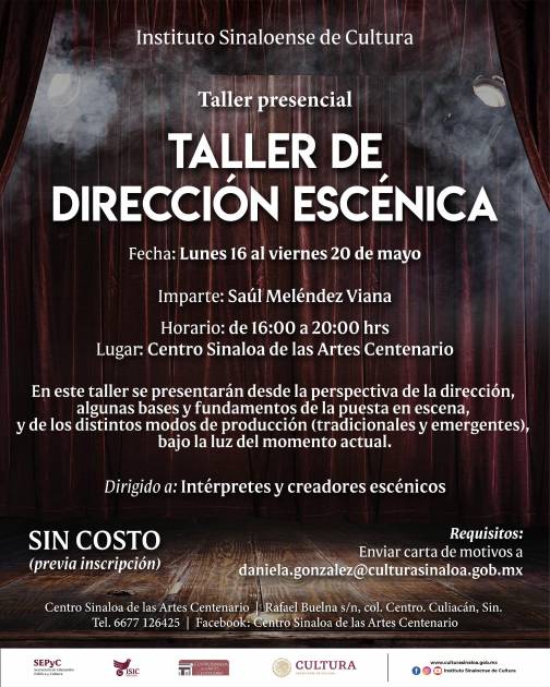 Culiacán, Sin.- Del lunes 16 al 20 de mayo, en las instalaciones del Centro Sinaloa de las Artes Centenario, el Instituto Sinaloense de Cultura llevará cabo el Taller de Dirección Escénica que impartirá de manera presencial y gratuita el maestro Saúl Meléndez Viana, con horarios de 16:00 a 20:00 horas.